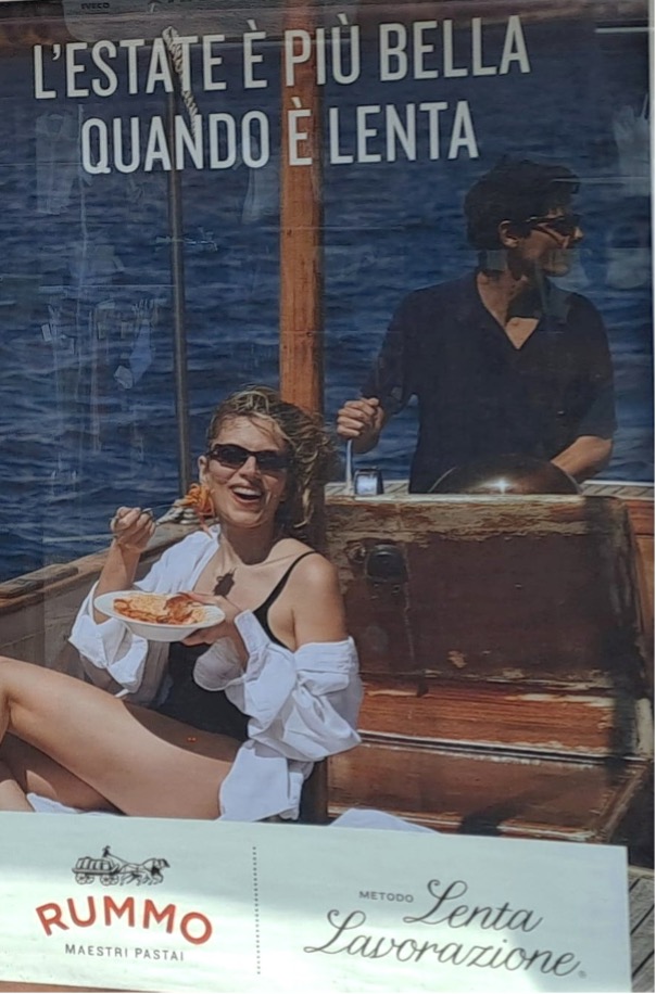 Tutti noi vorremmo che i ritmi dell’estate fossero più distesi e rilassati, un po’ come se vivessimo una eterna “gita in barca”. E RUMMO, con la sua “lenta” essiccazione – che ne garantisce tenuta alla cottura, qualità e inimitabile sapore – ne è l’esempio più calzante. In effetti, il messaggio tenta proprio di comunicarci questo: RUMMO rende le nostre giornate rilassanti e allontana la frenesia del quotidiano, anche quando si cucina! In altre parole, mangiando RUMMO, l’estate avrà ritmi più rilassanti e distensivi, e sarà pertanto più bella. Questi ambiziosi contenuti non sono asseriti, ma sono ricavabili per inferenza e, nello specifico, tramite implicatura. Presentarli implicitamente permette di evitare che i prodigi attribuiti a RUMMO appaiano esagerati e inverosimili, come invece risulterebbero subito per chiunque se fossero detti in modo esplicito.